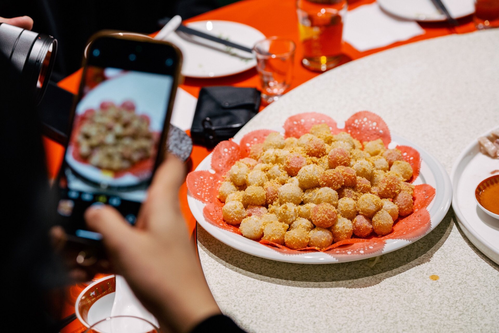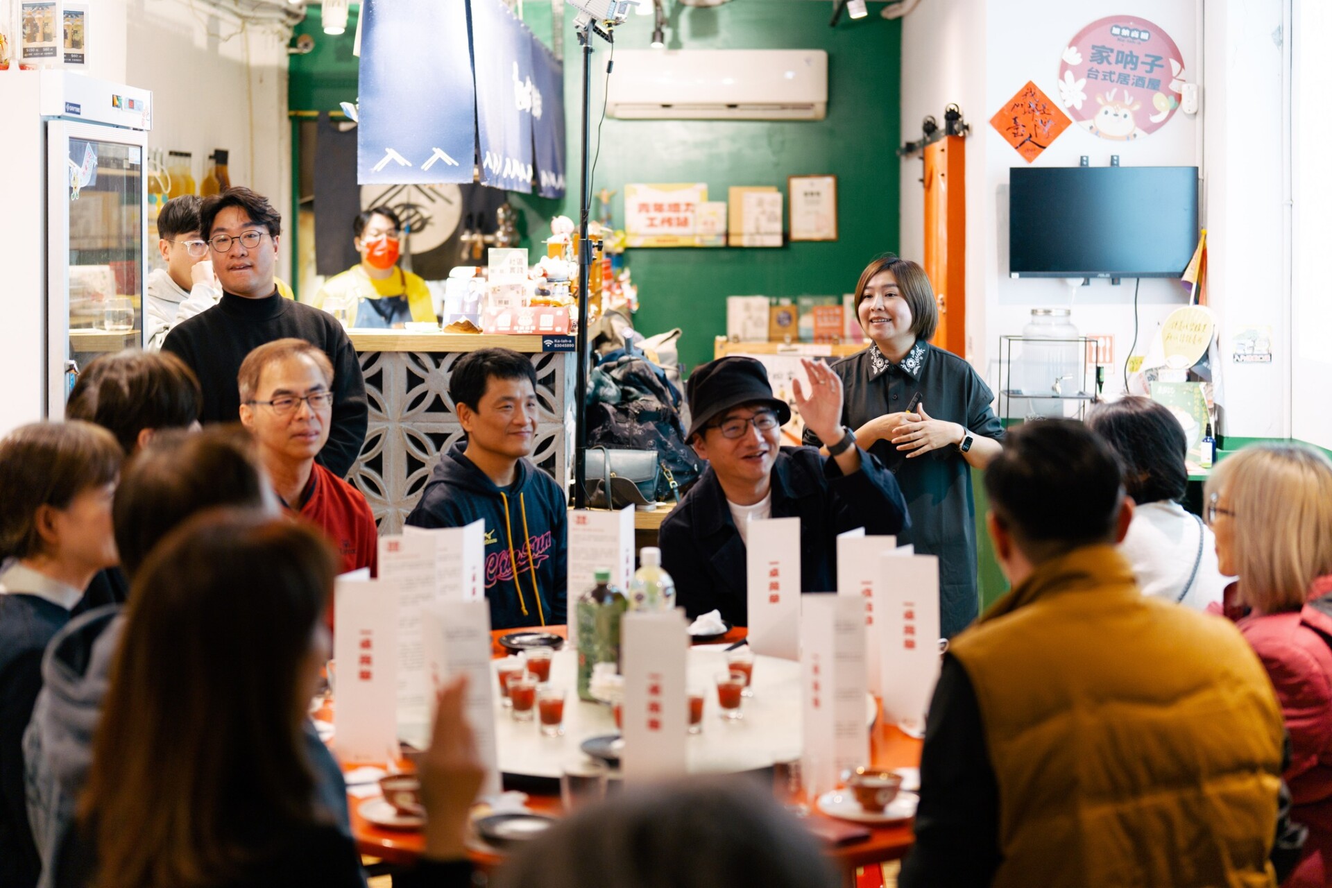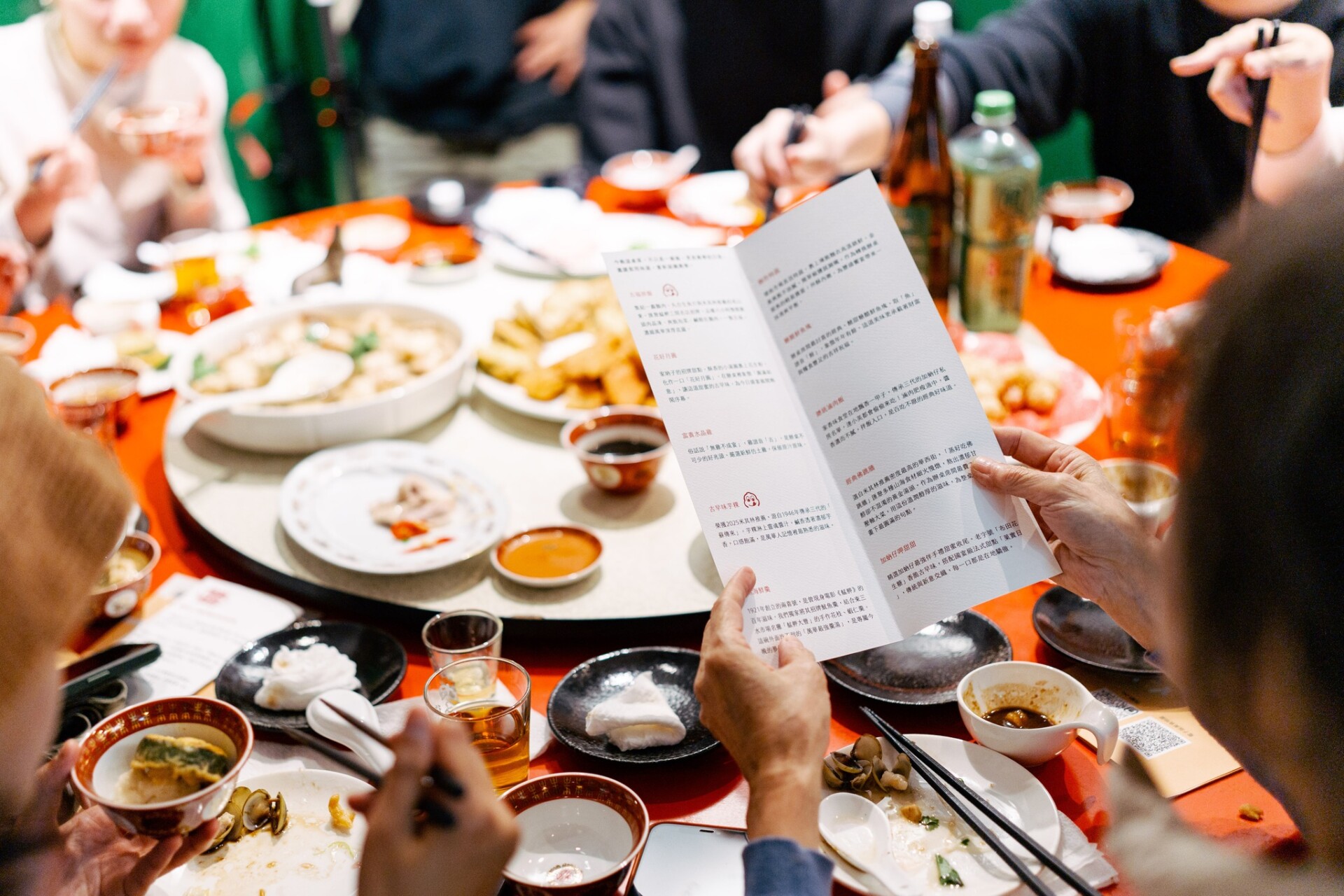 ② 辦桌文化的感官策展: 十全十美的宴席邏輯 我們以台灣傳統「辦桌」為論述核心,策劃「十道菜=十全十美」的完整文化體驗。從儀式感出發,提供帶有茉莉香氛的溫毛巾,以嗅覺連結加蚋仔的土地意象;在菜單設計上,則依循「起、承、轉、合」的節奏排比——從冷盤開胃、暖胃羹湯、厚實主菜到精緻甜點收尾。每道菜均附上專屬的文化解說卡,讓用餐過程轉化為一場深度的土地策展。
